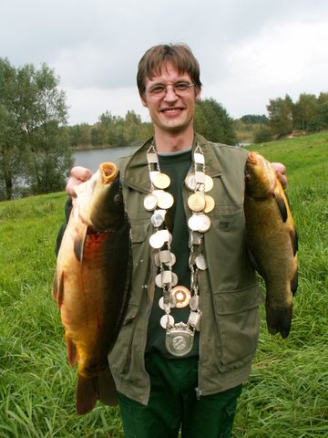 Mit diesem knapp 7 Pfund schweren Karpfen wurde Matthias Weißmann unser Angelkönig 2008. Als Beifang gab es noch eine 2 pfündige Schleie, die auch schon als Königsfisch gereicht hätte ... .