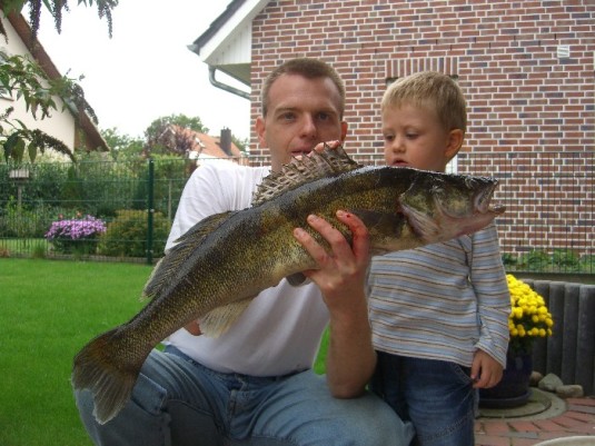 Dass 1. Vorsitzende auch angeln können, zeigt hier Thies Klingenberg, der diesen 75 cm langen und 7 1/2 Pfund schweren Zander im Funkturmsee fing.